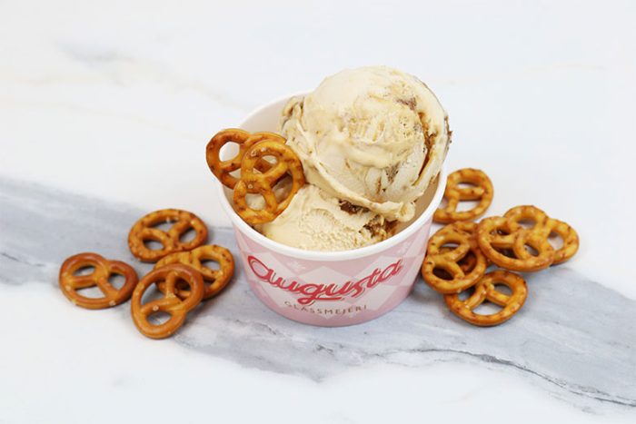 Jordnötsglass mellan lager av pretzel ganch med bitar Ingredienser: Mjölk, Gluten, Jordnötter.